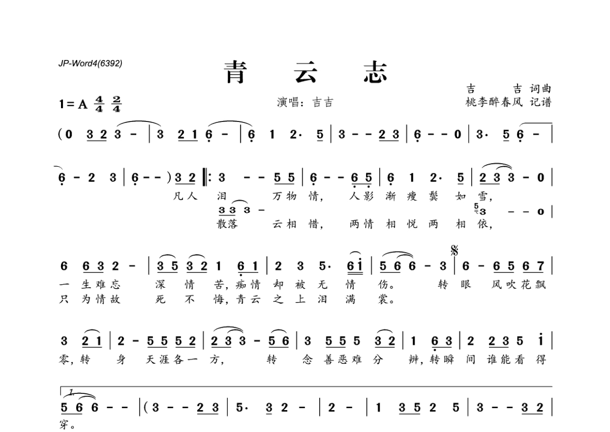 《青云志》是吉吉演唱的一首歌曲,拍号为4/4拍,这份简谱共有一张高清图谱,图谱由 @桃李醉春风 编配上传。