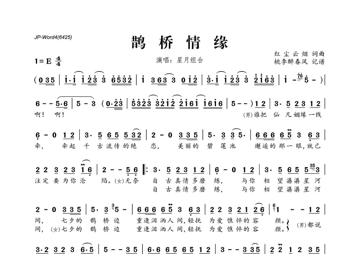 《鹊桥情缘》是星月组合演唱的一首歌曲,拍号为4/4拍,这份简谱共有一张高清图谱,图谱由 @桃李醉春风 编配上传。