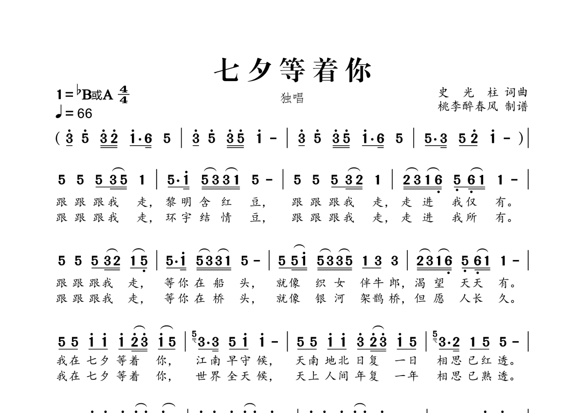 《七夕等着你》是独唱演唱的一首歌曲,拍号为4/4拍,这份简谱共有一张高清图谱,图谱由 @桃李醉春风 编配上传。
