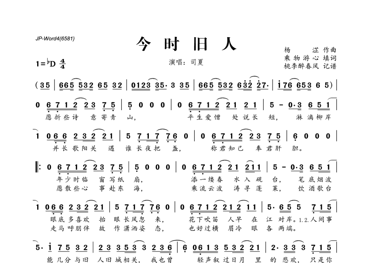 《今时旧人》是司夏演唱的一首歌曲,拍号为4/4拍,这份简谱共有一张高清图谱,图谱由 @桃李醉春风 编配上传。