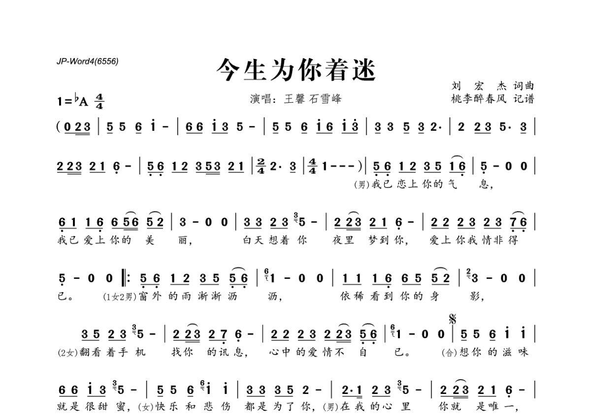 王馨&石雪峰《今生为你着迷》简谱