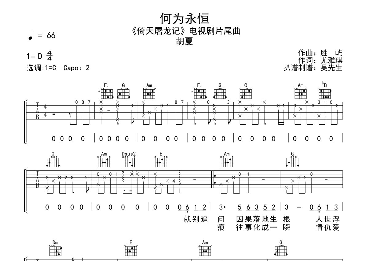 《何为永恒》是胡夏演唱的一首歌曲,本吉他谱采用的是C调指法编配,这份吉他谱共有两张高清图谱,图谱由 @吴先生TAB 编配上传,图谱使用六线谱编配,包含吉他和弦指法、简谱以及歌词部分,使用这份何为永恒吉他谱,可以让你更加方便地掌握这首歌曲的弹唱技巧,快来尝试吧。胡夏《何为永恒》吉他谱,新版电视剧《倚天屠龙记》片尾曲,何为永恒六线谱,原调D,选调C,Capo夹二品。高清图片谱。