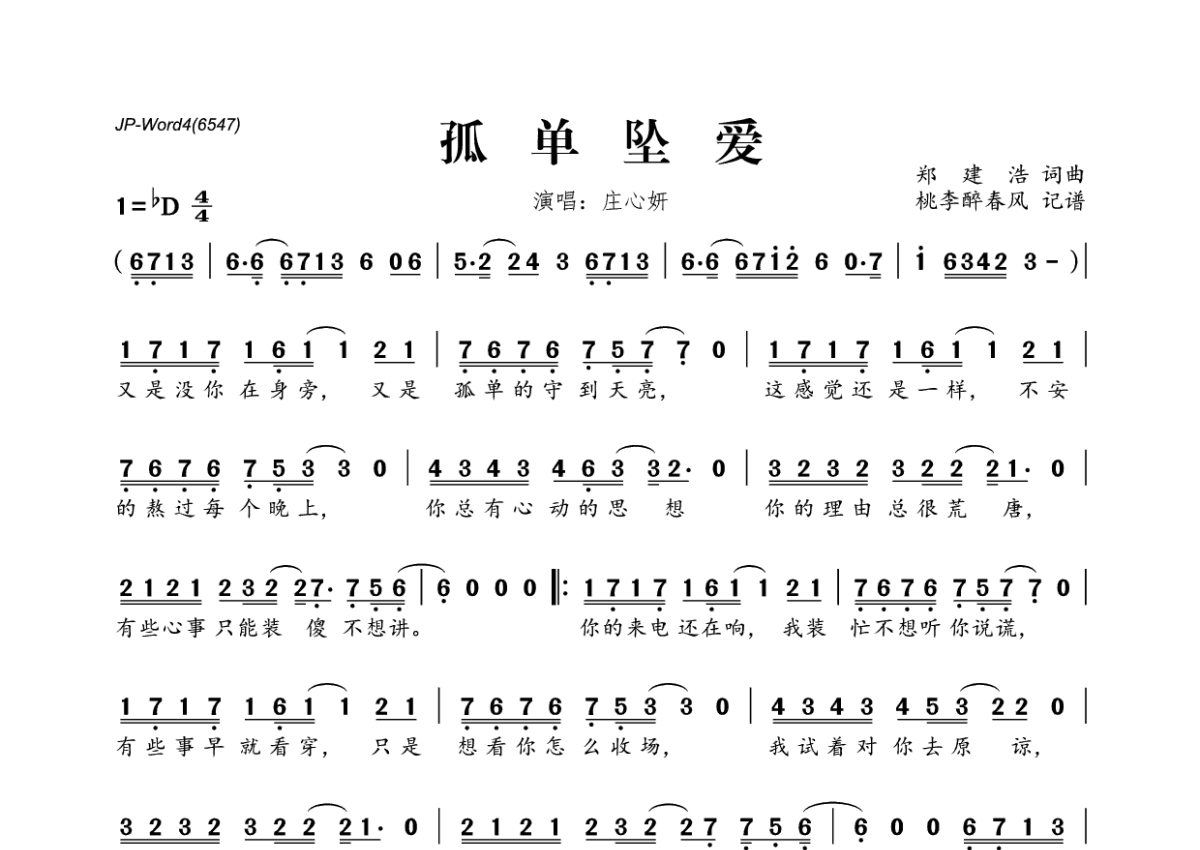 《孤单坠爱》是庄心妍演唱的一首歌曲,拍号为4/4拍,这份简谱共有一张高清图谱,图谱由 @桃李醉春风 编配上传。
