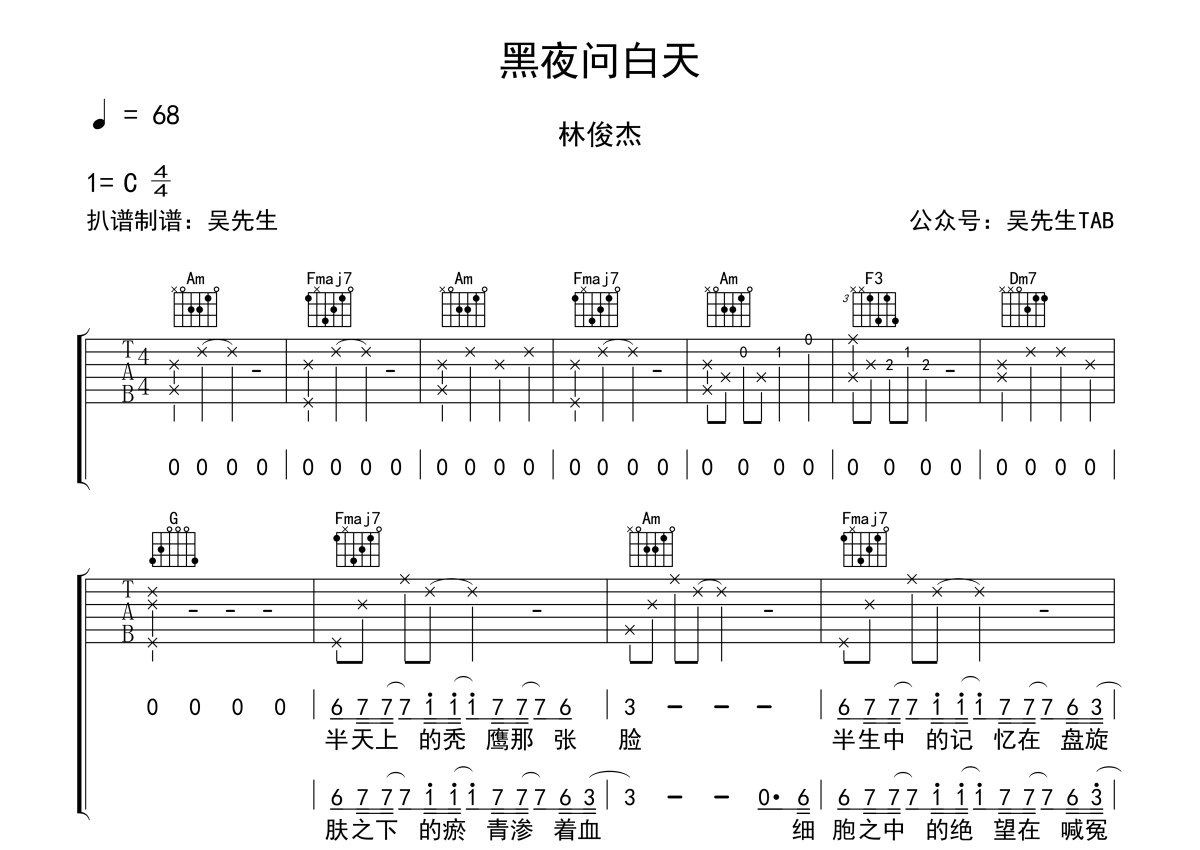 《黑夜问白天》是林俊杰演唱的一首歌曲,本吉他谱采用的是C调指法编配,这份吉他谱共有三张高清图谱,图谱由 @吴先生TAB 编配上传,图谱使用六线谱编配,包含吉他和弦指法、简谱以及歌词部分,使用这份黑夜问白天吉他谱,可以让你更加方便地掌握这首歌曲的弹唱技巧,快来尝试吧。黑夜问白天吉他谱 C调 林俊杰 吴先生TAB。