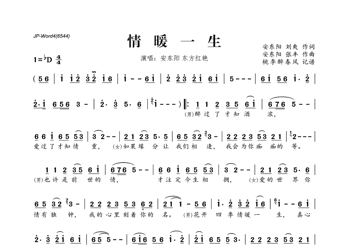《情暖一生》是安东阳&东方红艳演唱的一首歌曲,拍号为4/4拍,这份简谱共有一张高清图谱,图谱由 @桃李醉春风 编配上传。