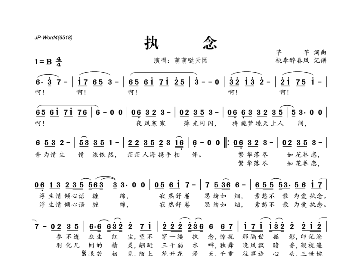 《执念》是萌萌哒天团演唱的一首歌曲,拍号为4/4拍,这份简谱共有一张高清图谱,图谱由 @桃李醉春风 编配上传。