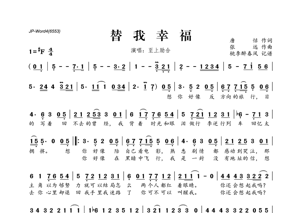 《替我幸福》是至上励合演唱的一首歌曲,拍号为4/4拍,这份简谱共有两张高清图谱,图谱由 @桃李醉春风 编配上传。