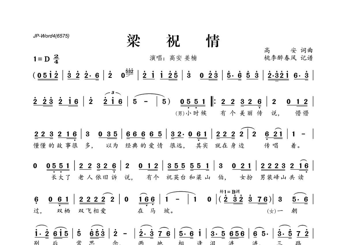 《梁祝情》是高安&姜楠演唱的一首歌曲,拍号为2/4拍,这份简谱共有一张高清图谱,图谱由 @桃李醉春风 编配上传。