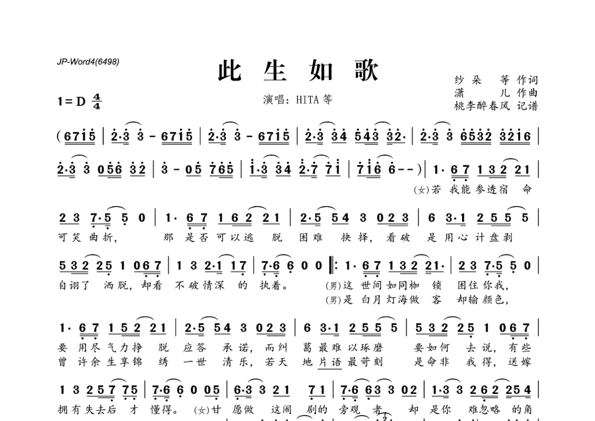 《此生如歌》是HITA&奇然&许多葵等很多人演唱的一首歌曲,拍号为4/4拍,这份简谱共有一张高清图谱,图谱由 @桃李醉春风 编配上传。
