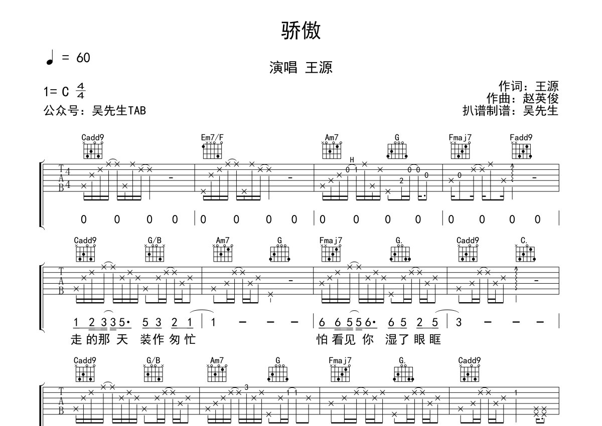 王源《骄傲》吉他谱 - C调弹唱六线谱