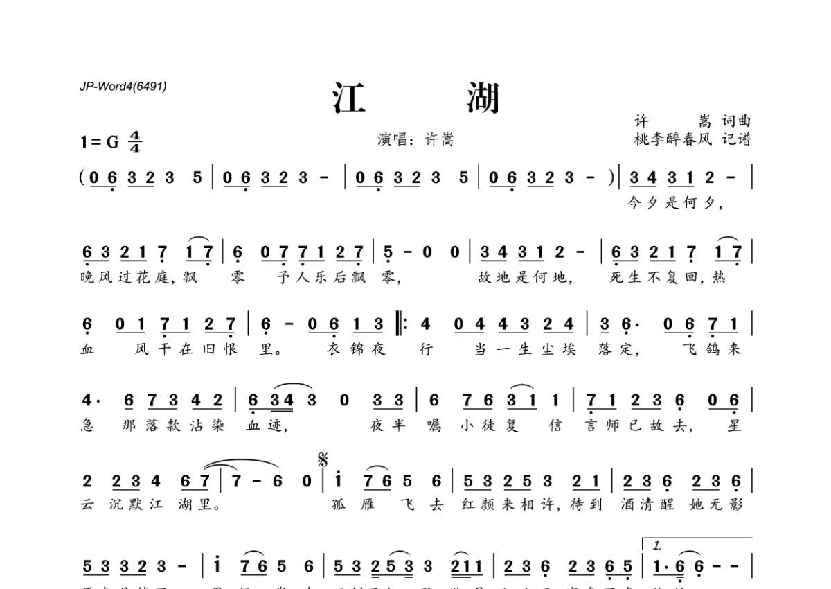 《江湖》是许嵩演唱的一首歌曲,拍号为4/4拍,这份简谱共有一张高清图谱,图谱由 @桃李醉春风 编配上传。