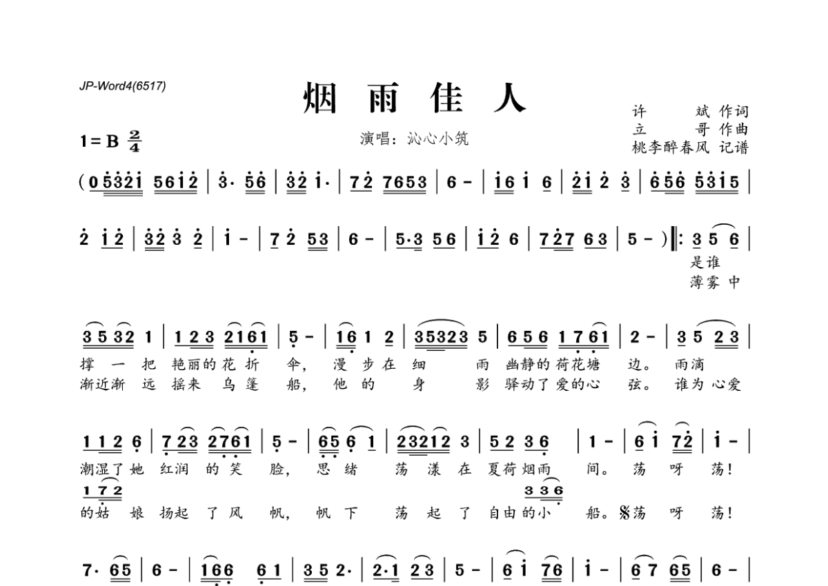 《烟雨佳人》是沁心小筑演唱的一首歌曲,拍号为2/4拍,这份简谱共有一张高清图谱,图谱由 @桃李醉春风 编配上传。