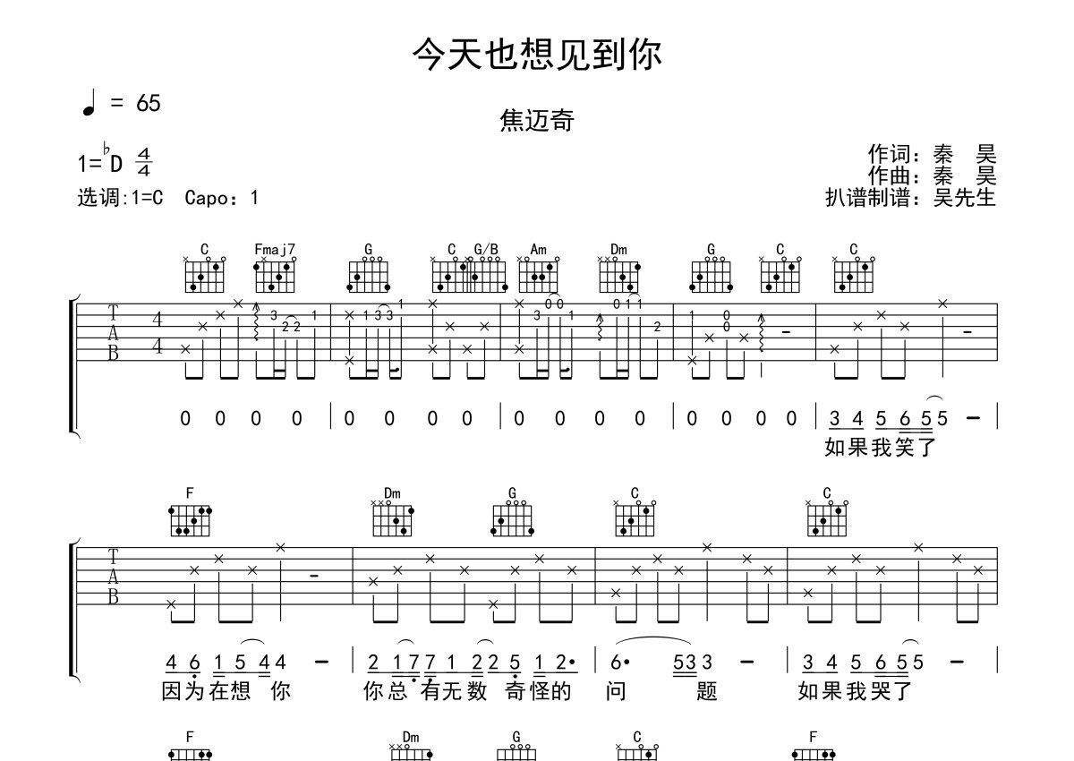 焦迈奇《今天也想见到你》吉他谱 - C调弹唱六线谱