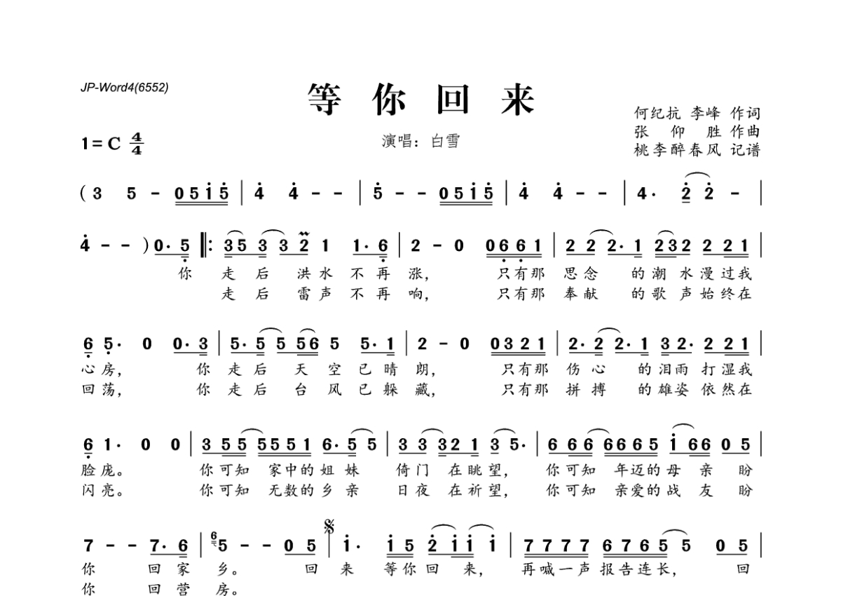 《等你回来》是白雪演唱的一首歌曲,拍号为4/4拍,这份简谱共有一张高清图谱,图谱由 @桃李醉春风 编配上传。