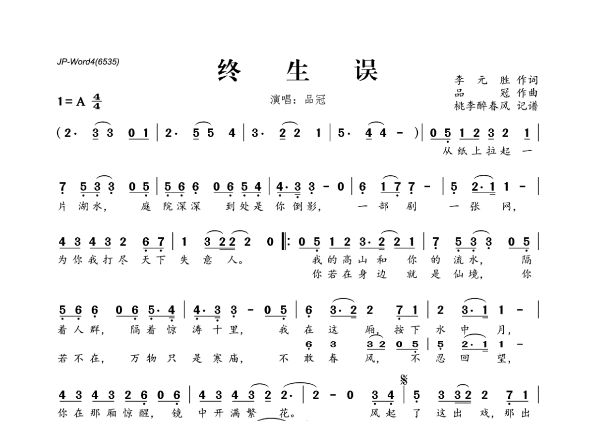 《终生误》是品冠演唱的一首歌曲,拍号为4/4拍,这份简谱共有一张高清图谱,图谱由 @桃李醉春风 编配上传。