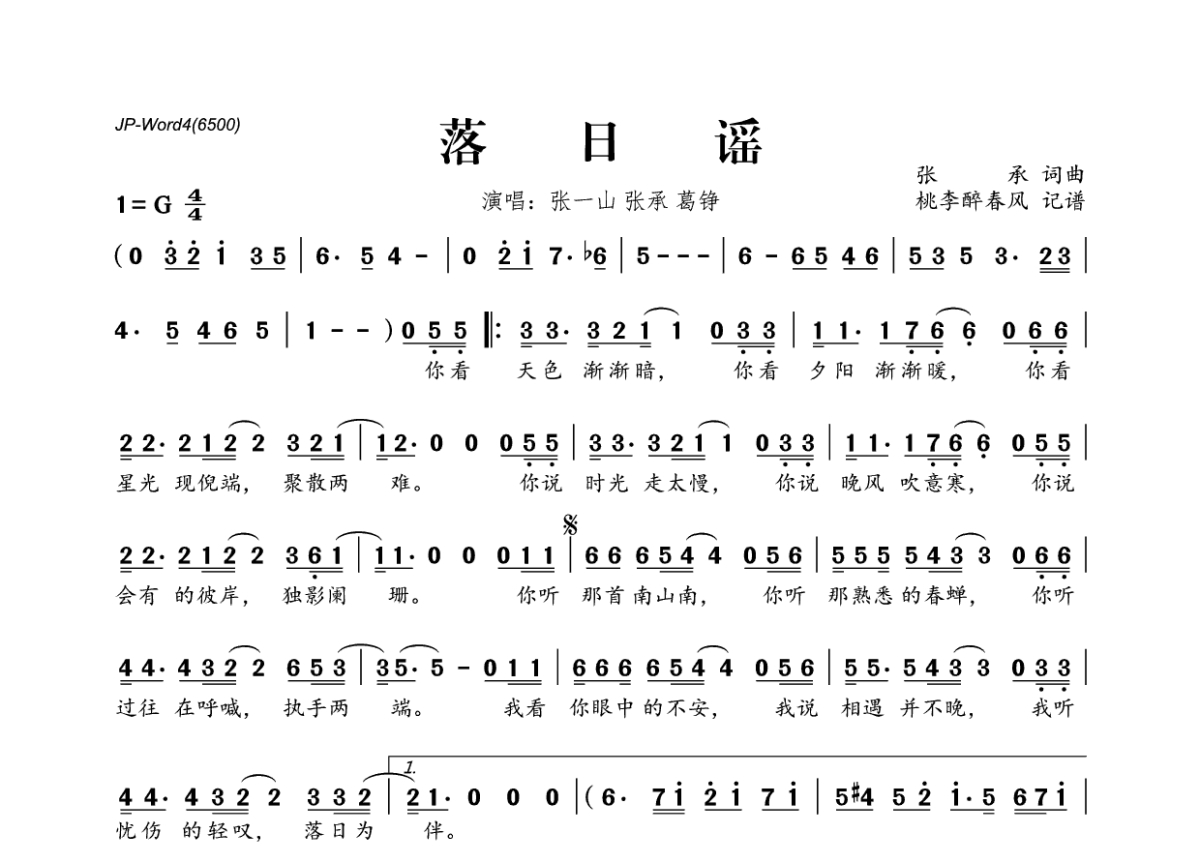 《落日谣》是张一山&张承&葛铮演唱的一首歌曲,拍号为4/4拍,这份简谱共有一张高清图谱,图谱由 @桃李醉春风 编配上传。