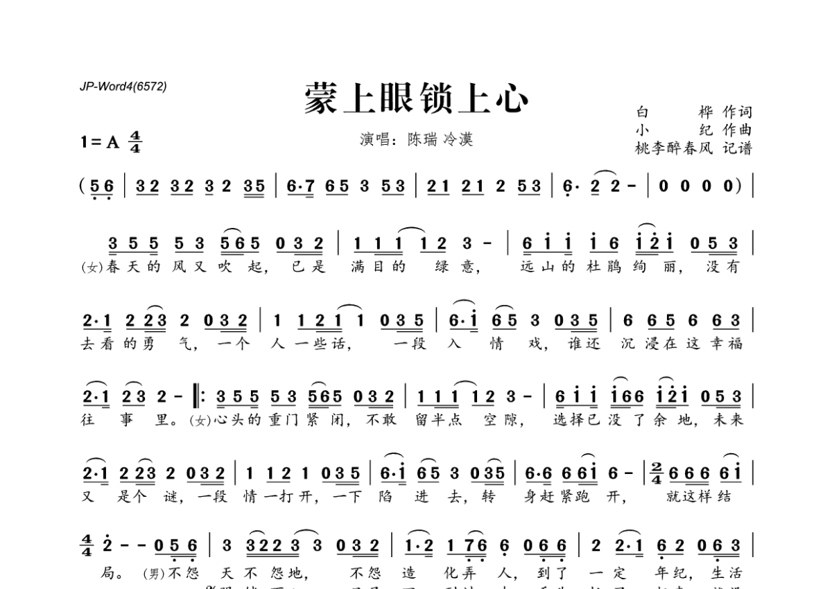《蒙上眼 锁上心》是陈瑞&冷漠演唱的一首歌曲,拍号为4/4拍,这份简谱共有一张高清图谱,图谱由 @桃李醉春风 编配上传。