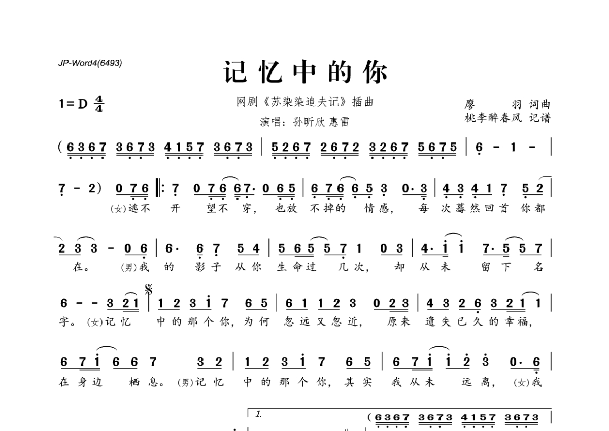 孙昕欣&惠雷《记忆中的你》简谱