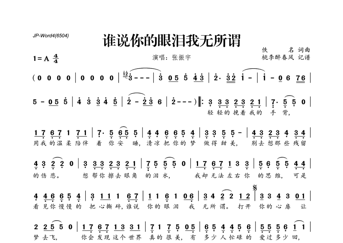 张振宇《谁说你的眼泪我无所谓》简谱
