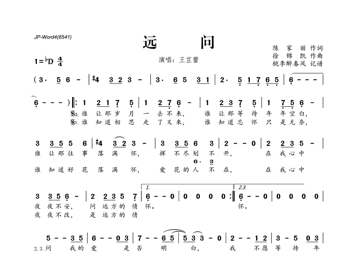 《远问》是王芷蕾演唱的一首歌曲,拍号为4/4拍,这份简谱共有一张高清图谱,图谱由 @桃李醉春风 编配上传。