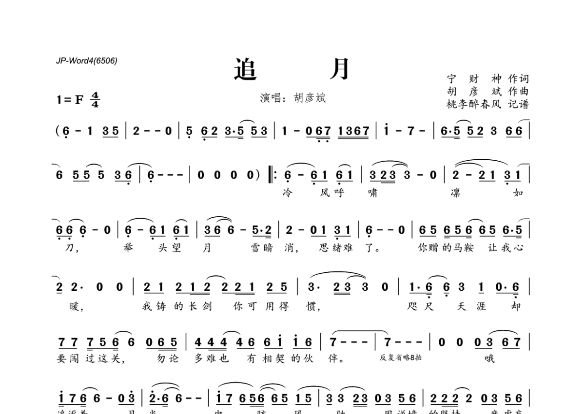 《追月》是胡彦斌演唱的一首歌曲,拍号为4/4拍,这份简谱共有一张高清图谱,图谱由 @桃李醉春风 编配上传。