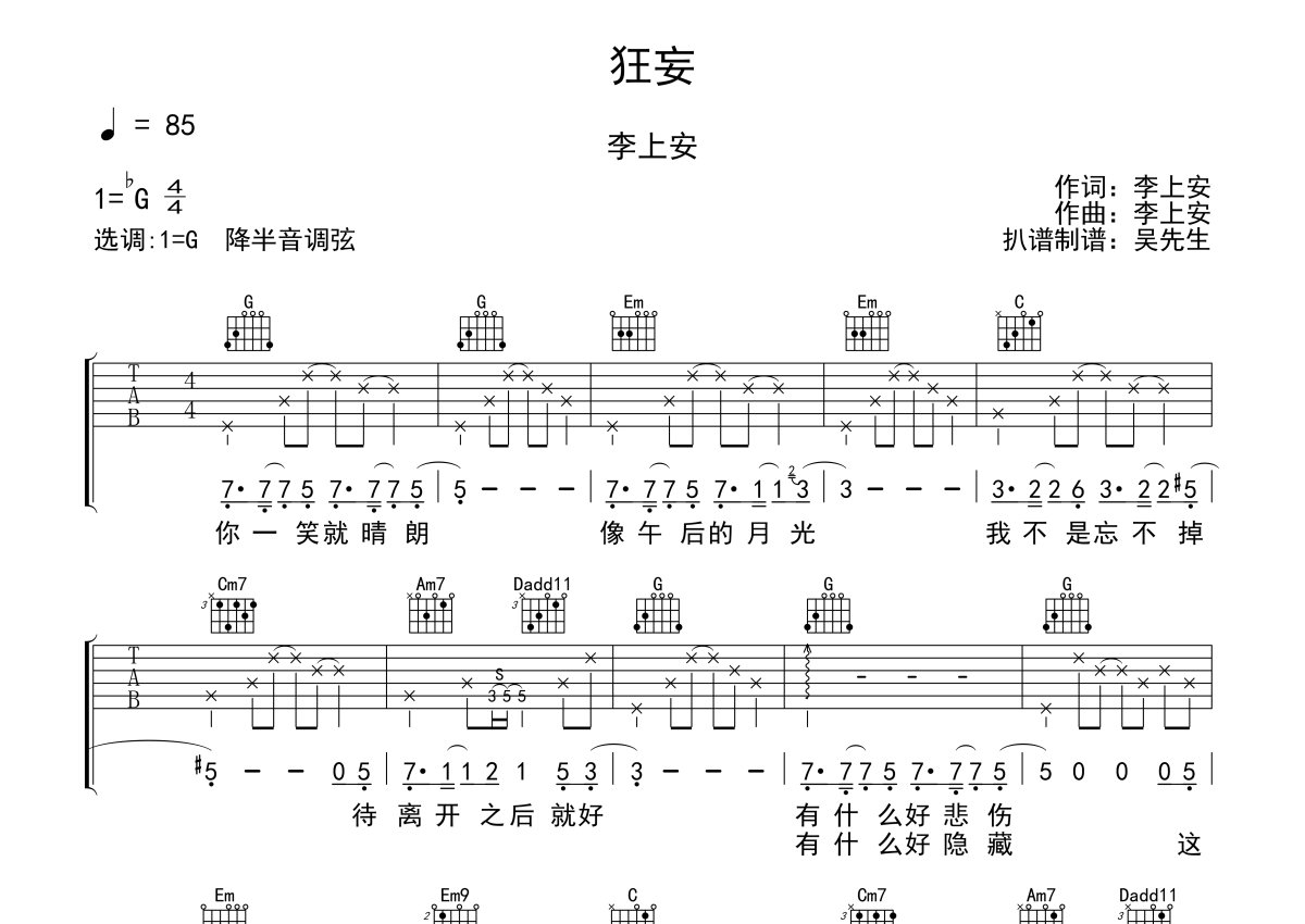李上安《狂妄》吉他谱 - G调弹唱六线谱