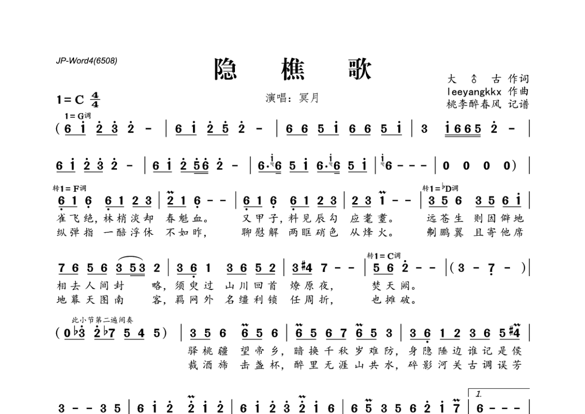 《隐樵歌》是冥月演唱的一首歌曲,拍号为4/4拍,这份简谱共有一张高清图谱,图谱由 @桃李醉春风 编配上传。