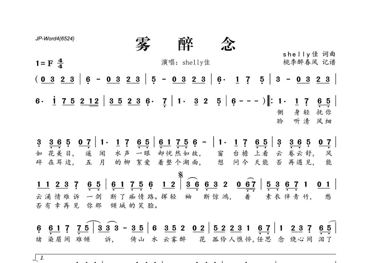 《雾醉念》是shelly佳演唱的一首歌曲,拍号为4/4拍,这份简谱共有一张高清图谱,图谱由 @桃李醉春风 编配上传。