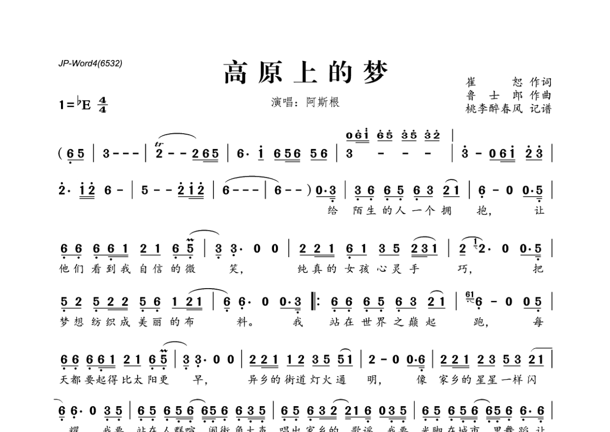 《高原上的梦》是阿斯根演唱的一首歌曲,拍号为4/4拍,这份简谱共有一张高清图谱,图谱由 @桃李醉春风 编配上传。