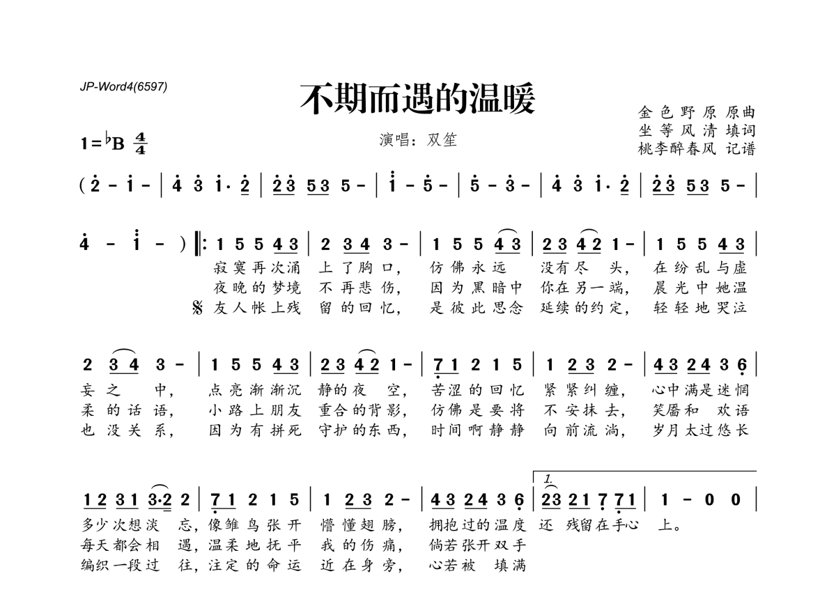 《不期而遇的温暖》是双笙演唱的一首歌曲,拍号为4/4拍,这份简谱共有一张高清图谱,图谱由 @桃李醉春风 编配上传。