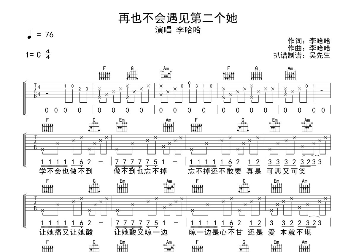 李哈哈《再也不会遇见第二个她》吉他谱 - C调弹唱六线谱