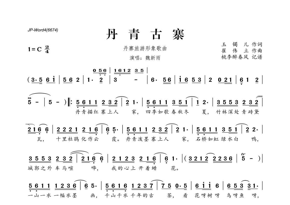 《丹青古寨》是魏新雨演唱的一首歌曲,拍号为2/4拍,这份简谱共有一张高清图谱,图谱由 @桃李醉春风 编配上传。