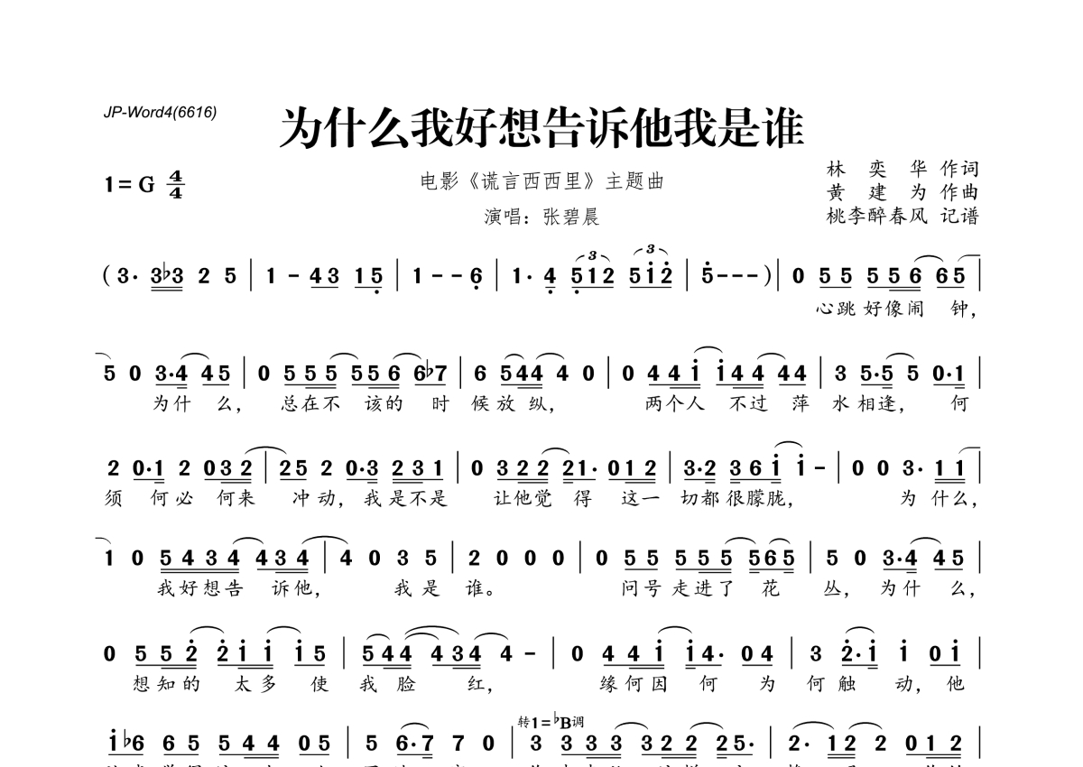《为什么我好想告诉他我是谁》是张碧晨演唱的一首歌曲,拍号为4/4拍,这份简谱共有一张高清图谱,图谱由 @桃李醉春风 编配上传。