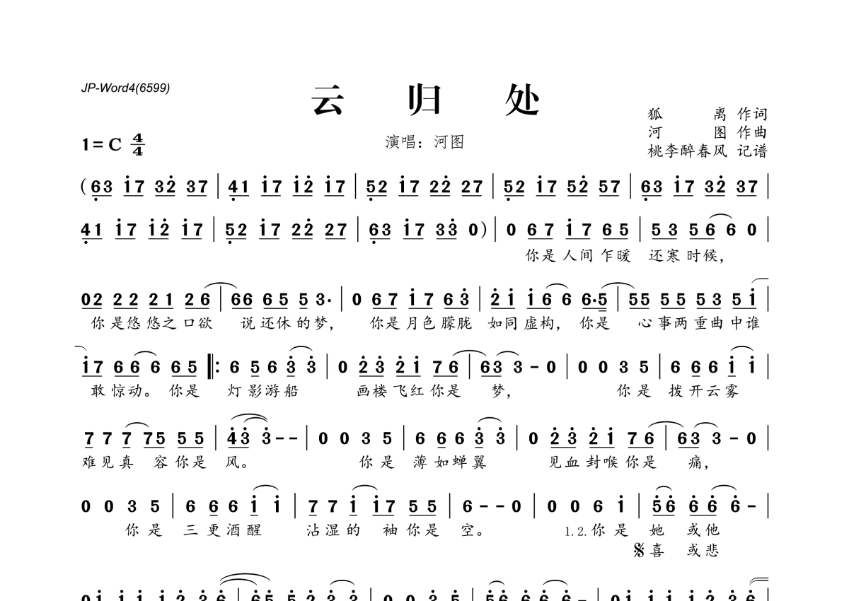 《云归处》是河图演唱的一首歌曲,拍号为4/4拍,这份简谱共有一张高清图谱,图谱由 @桃李醉春风 编配上传。