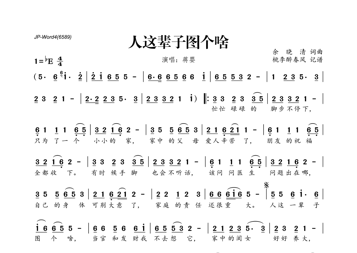 《人这辈子图个啥》是蒋婴演唱的一首歌曲,拍号为4/4拍,这份简谱共有一张高清图谱,图谱由 @桃李醉春风 编配上传。