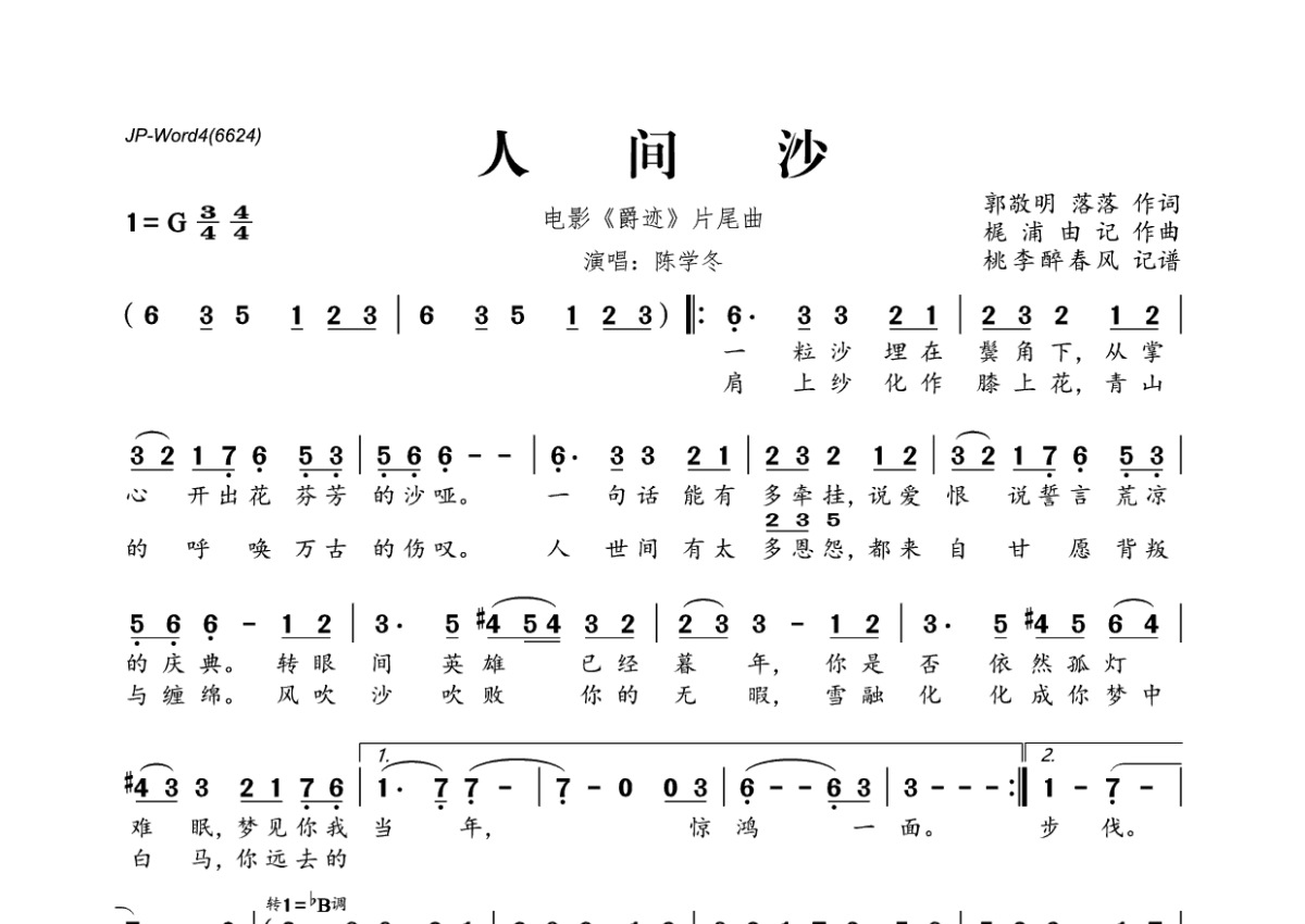 《人间沙》是陈学冬演唱的一首歌曲,拍号为4/4拍,这份简谱共有一张高清图谱,图谱由 @桃李醉春风 编配上传。