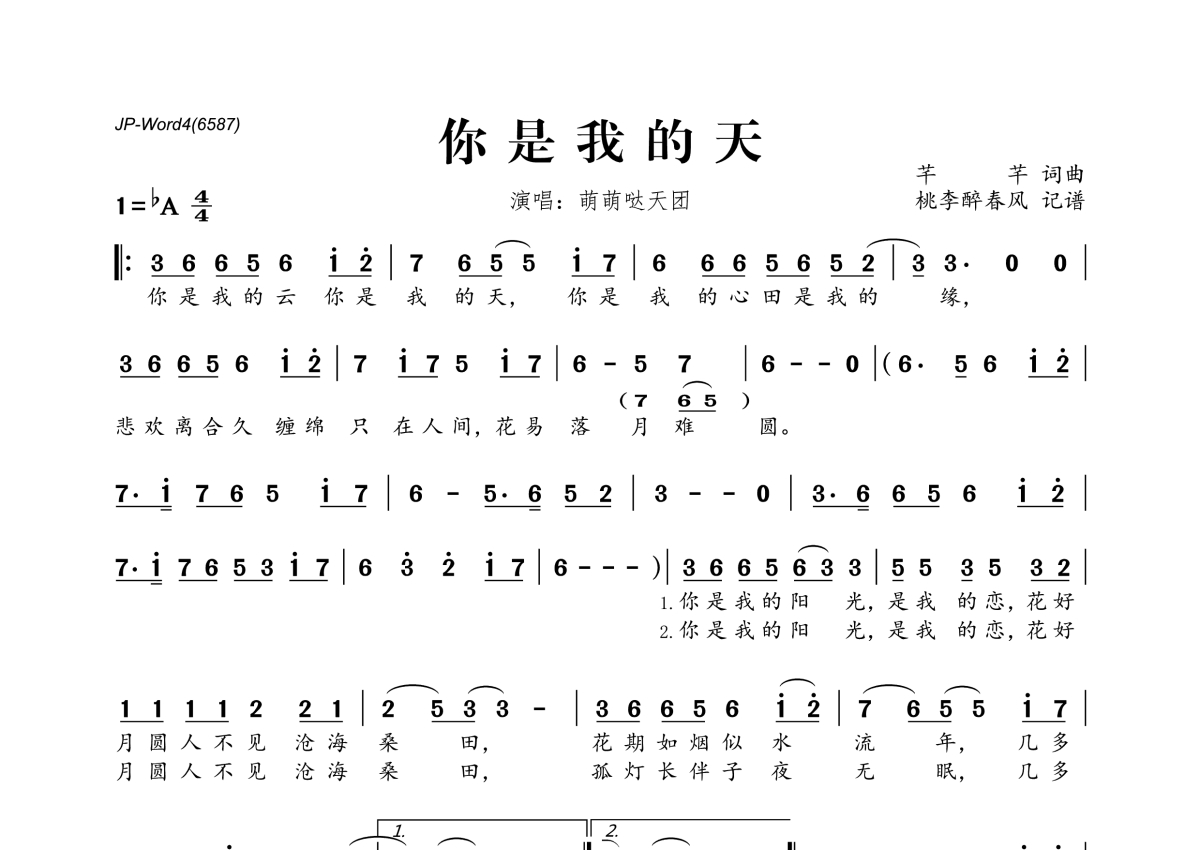 《你是我的天》是萌萌哒天团演唱的一首歌曲,拍号为4/4拍,这份简谱共有一张高清图谱,图谱由 @桃李醉春风 编配上传。