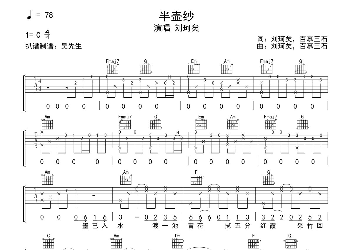 刘珂矣《半壶纱》吉他谱 - C调弹唱六线谱