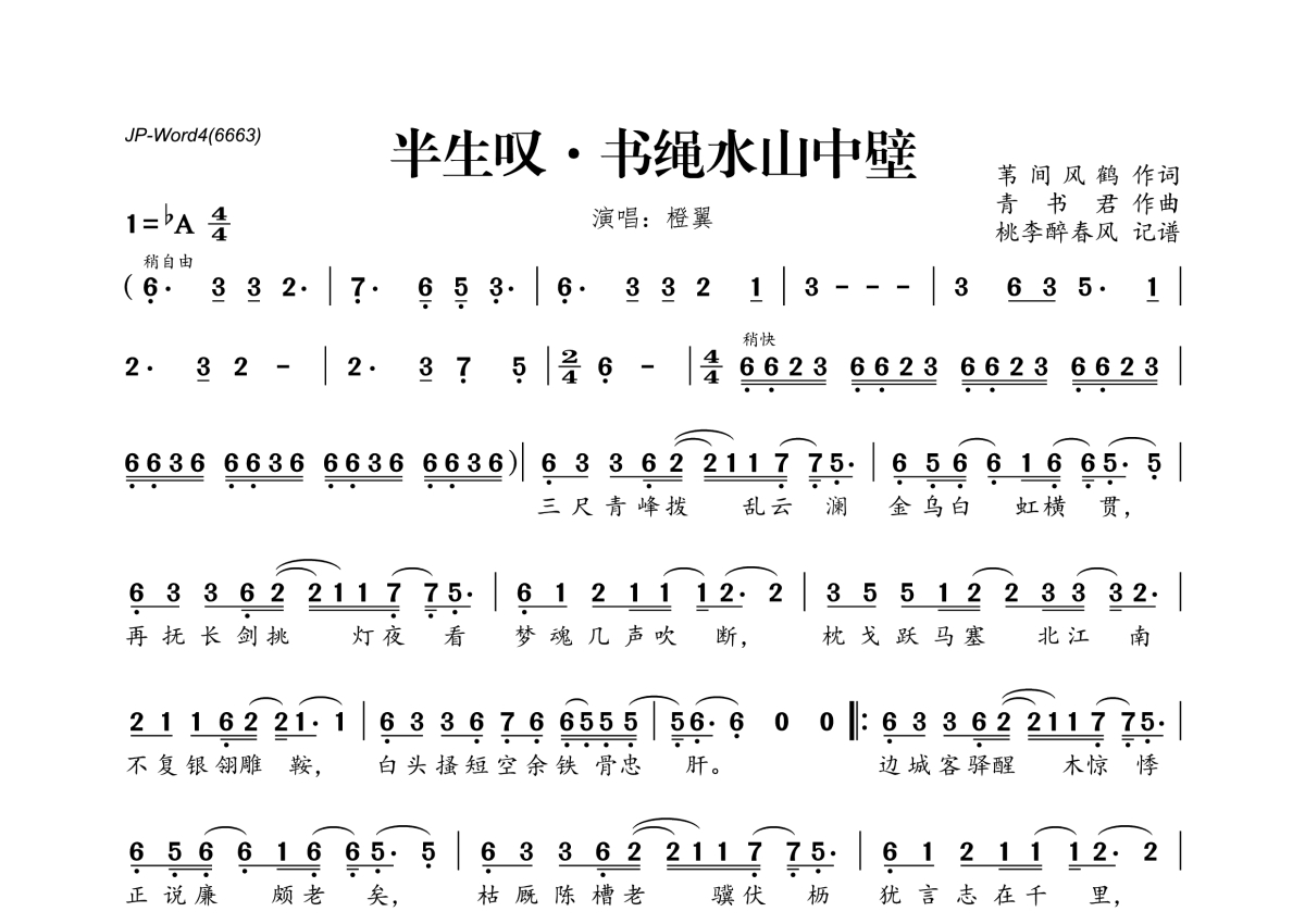 橙翼《半生叹·书绳水山中壁》简谱