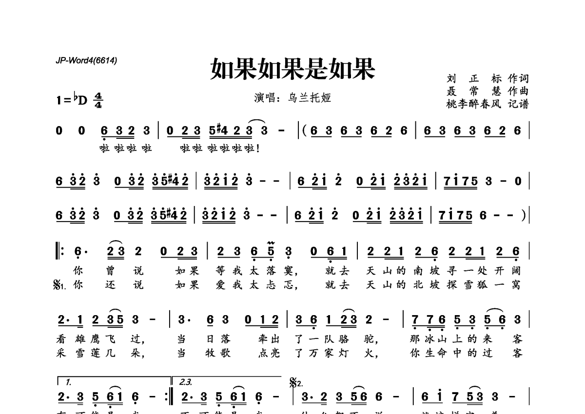 《如果如果是如果》是乌兰托娅演唱的一首歌曲,拍号为4/4拍,这份简谱共有一张高清图谱,图谱由 @桃李醉春风 编配上传。