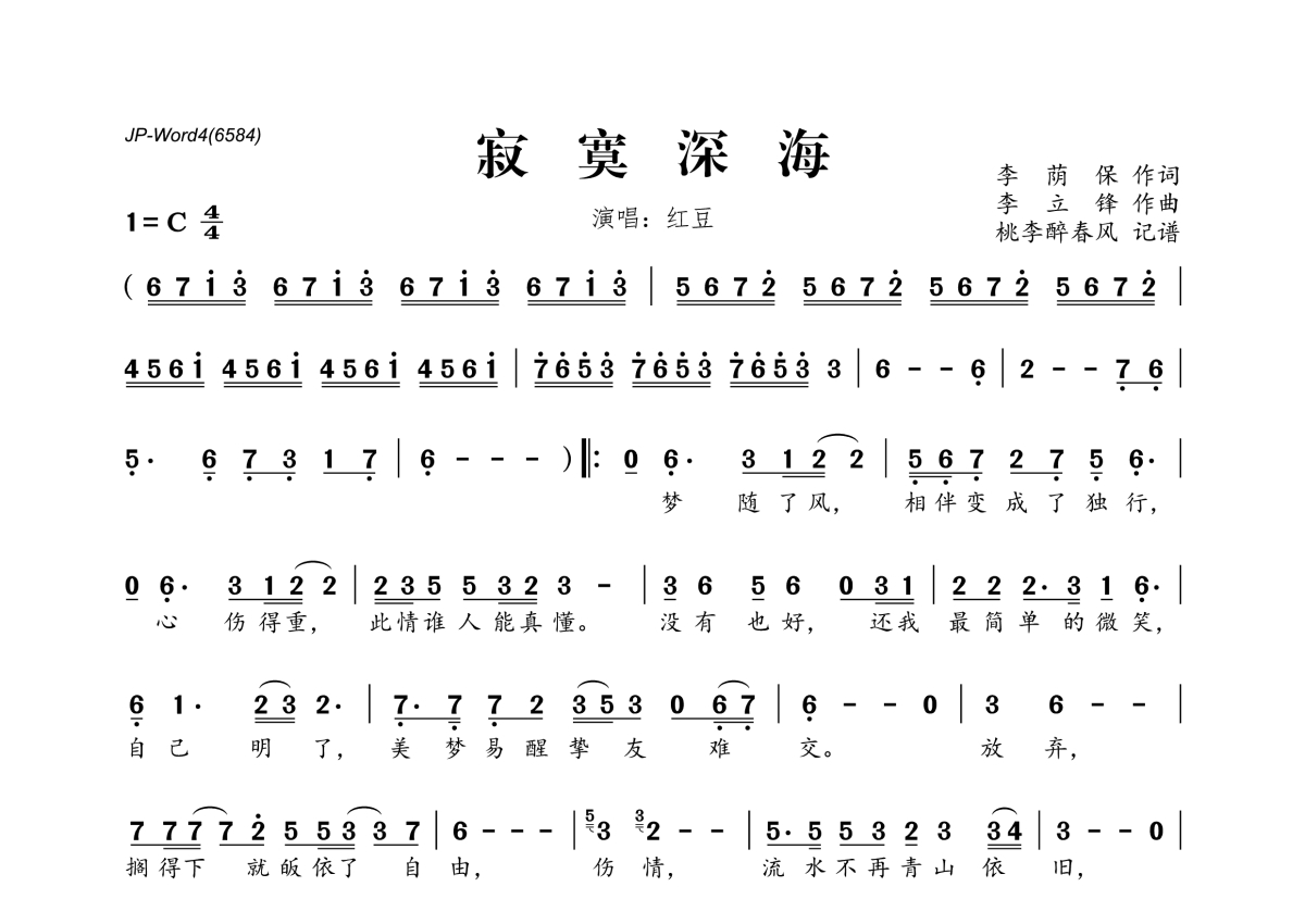 《寂寞深海》是红豆演唱的一首歌曲,拍号为4/4拍,这份简谱共有一张高清图谱,图谱由 @桃李醉春风 编配上传。