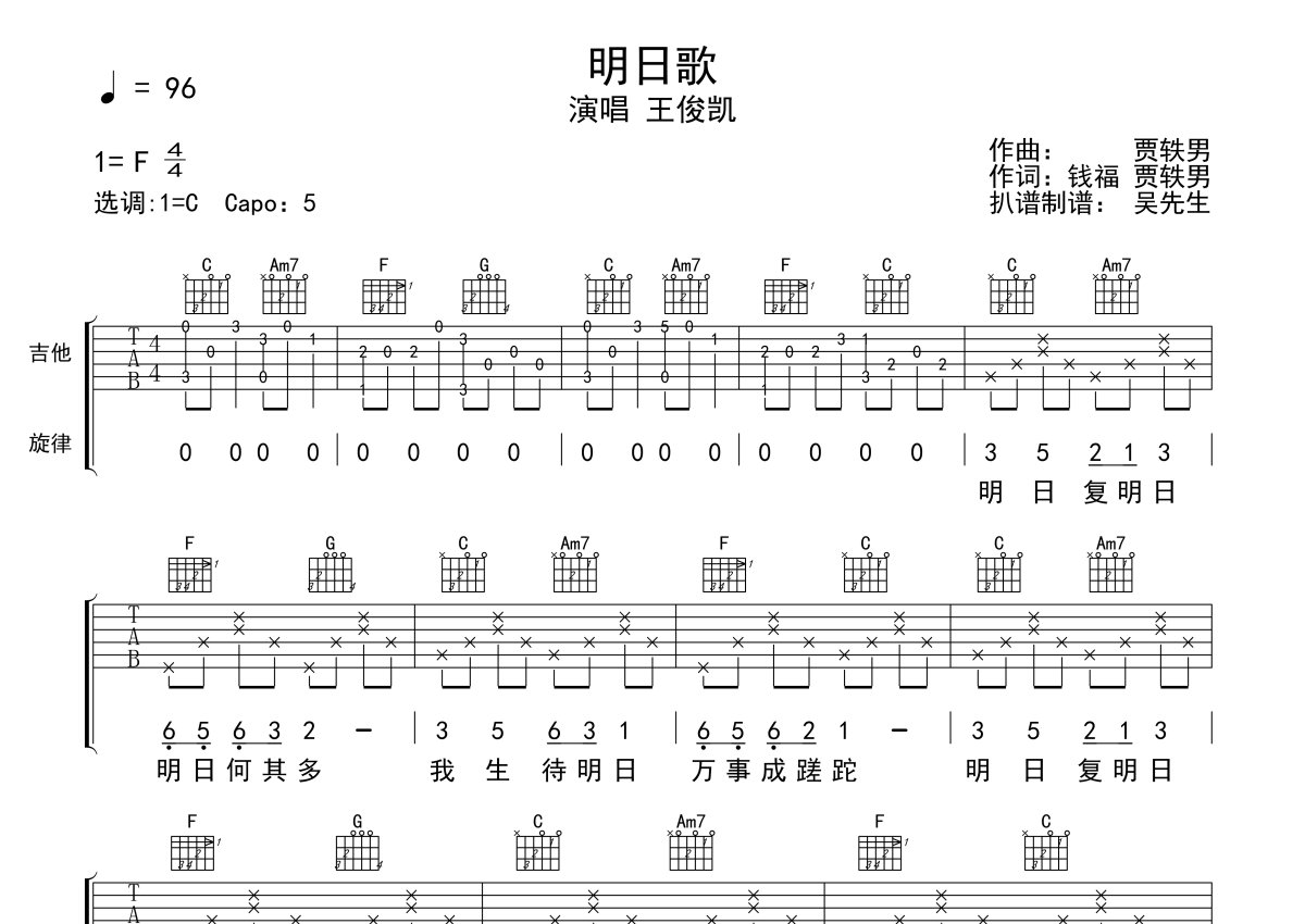 《明日歌》是王俊凯演唱的一首歌曲,本吉他谱采用的是C调指法编配,这份吉他谱共有两张高清图谱,图谱由 @吴先生TAB 编配上传,图谱使用六线谱编配,包含吉他和弦指法、简谱以及歌词部分,使用这份明日歌吉他谱,可以让你更加方便地掌握这首歌曲的弹唱技巧,快来尝试吧。明日歌吉他谱,王俊凯演唱,一首正能量励志歌曲,《经典咏流传》第1期节目曲目,《明日歌》吉他六线谱,高清图片弹唱谱,原调F,选用C调,Capo夹5品。