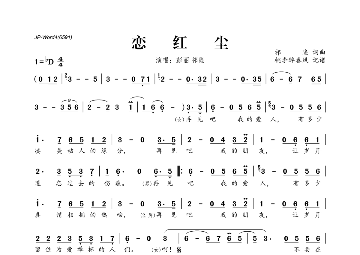《恋红尘》是祁隆&彭丽嘉演唱的一首歌曲,拍号为4/4拍,这份简谱共有一张高清图谱,图谱由 @桃李醉春风 编配上传。