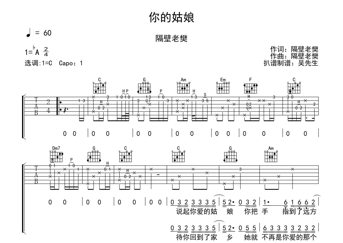 隔壁老樊《你的姑娘》吉他谱 - C调弹唱六线谱
