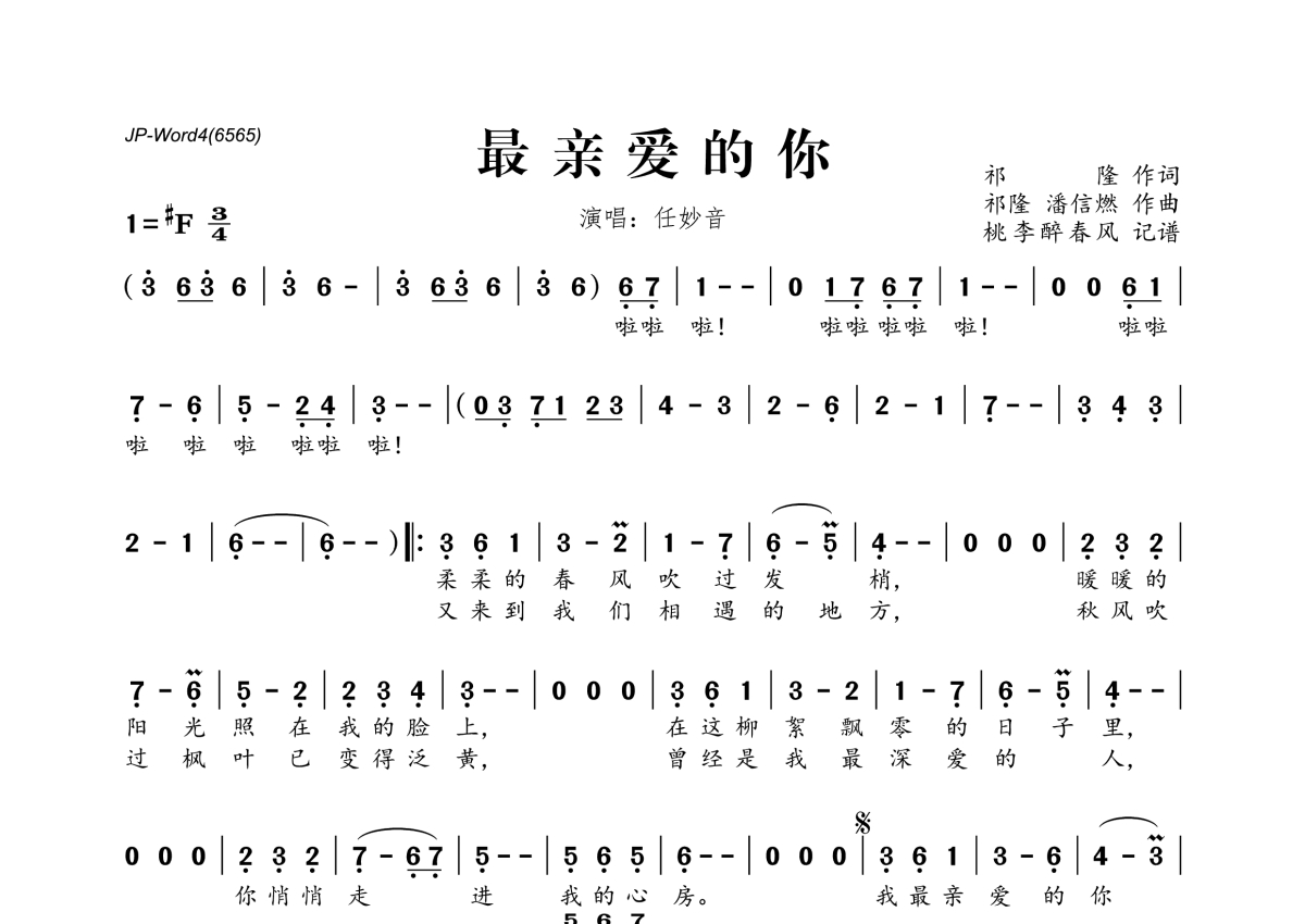 《最亲爱的你》是任妙音演唱的一首歌曲,拍号为3/4拍,这份简谱共有一张高清图谱,图谱由 @桃李醉春风 编配上传。