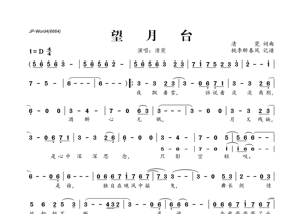 《望月台》是清莞演唱的一首歌曲,拍号为4/4拍,这份简谱共有一张高清图谱,图谱由 @桃李醉春风 编配上传。