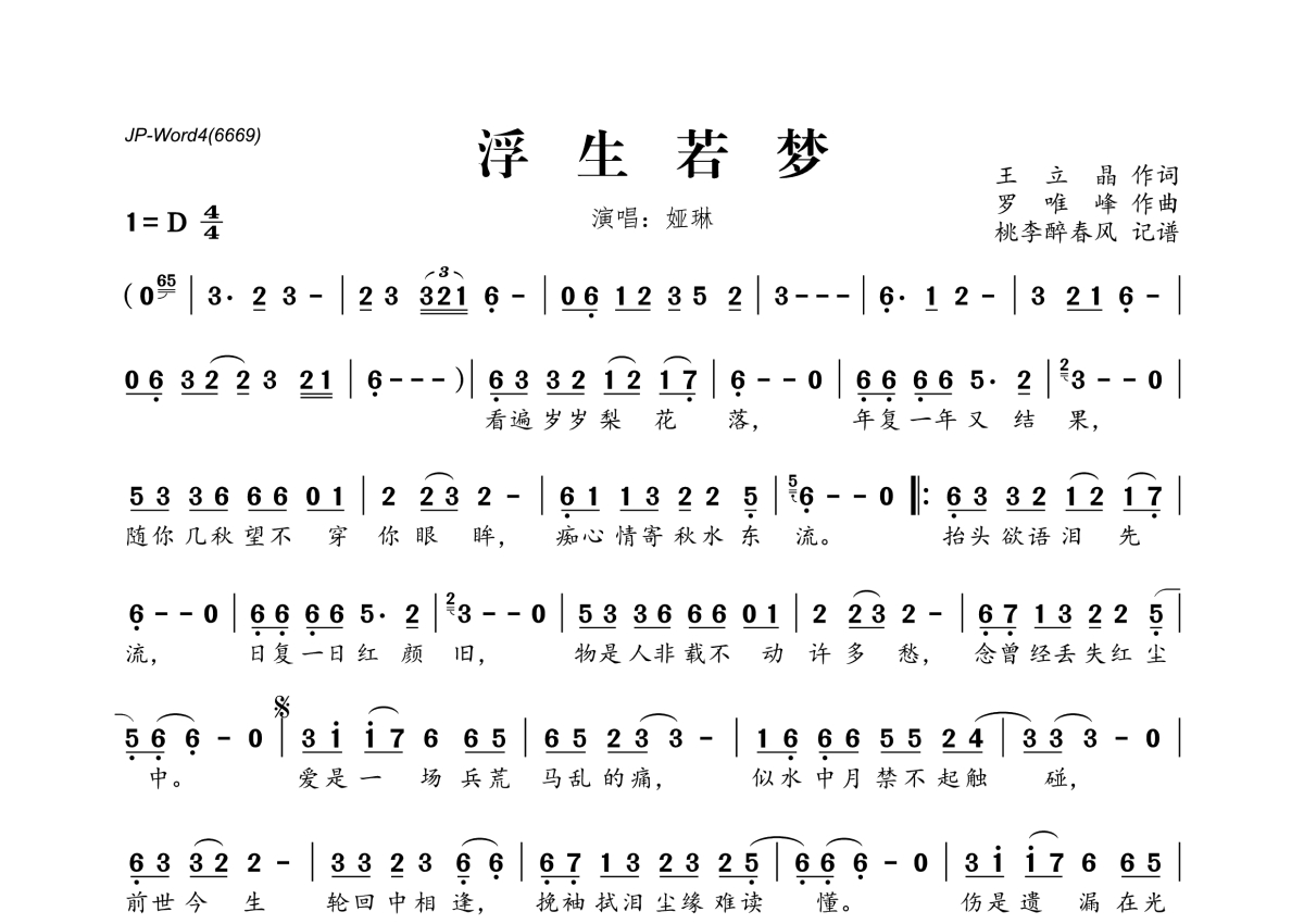 《浮生若梦》是娅琳演唱的一首歌曲,拍号为4/4拍,这份简谱共有一张高清图谱,图谱由 @桃李醉春风 编配上传。