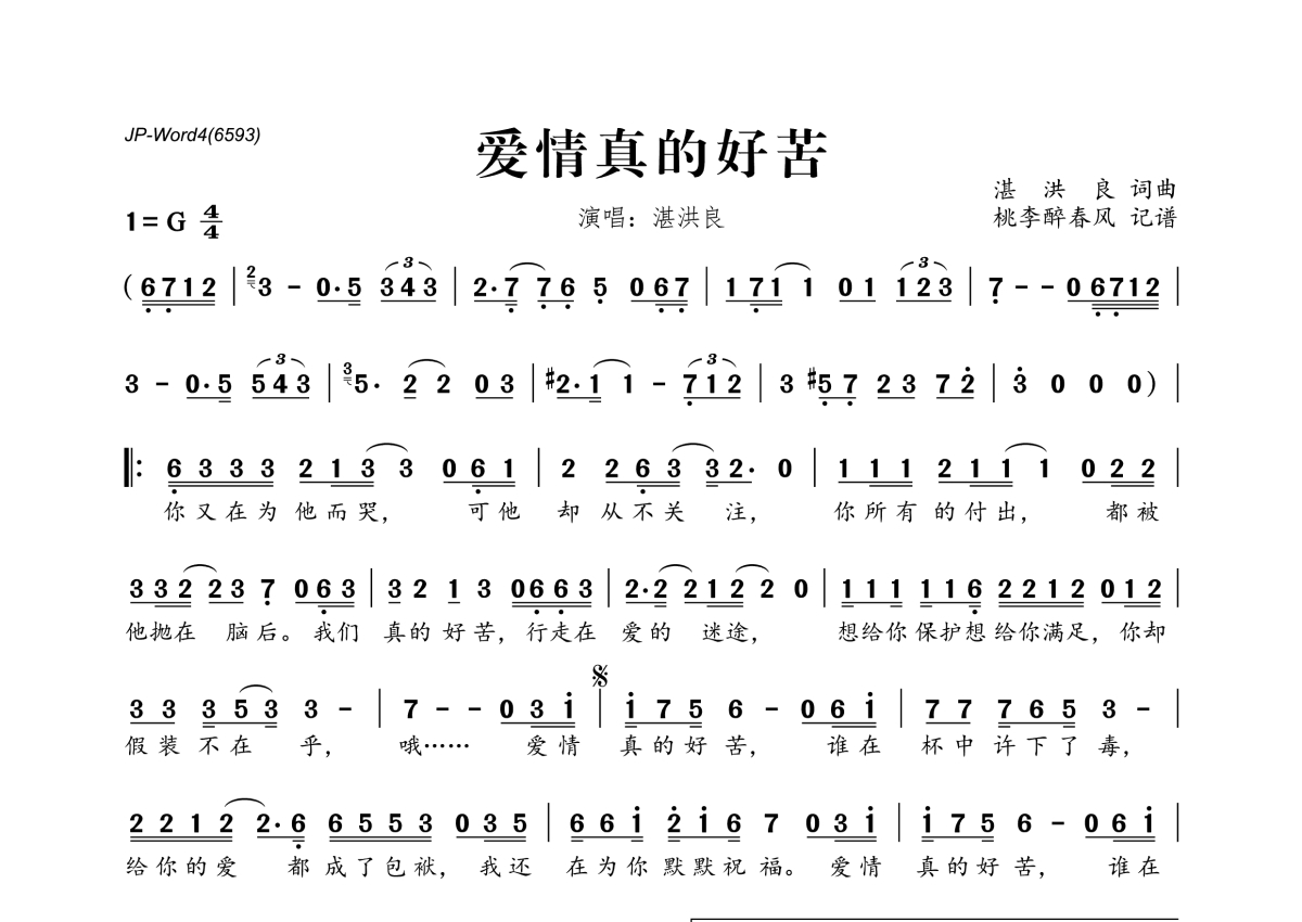 《爱情真的好苦》是湛洪良演唱的一首歌曲,拍号为4/4拍,这份简谱共有一张高清图谱,图谱由 @桃李醉春风 编配上传。