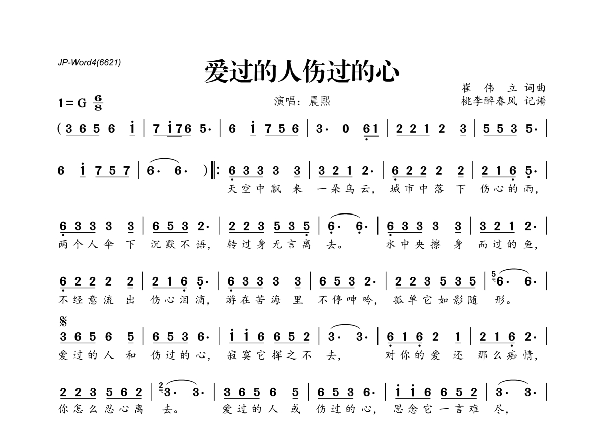 《爱过的人伤过的心》是晨熙演唱的一首歌曲,拍号为6/8拍,这份简谱共有一张高清图谱,图谱由 @桃李醉春风 编配上传。