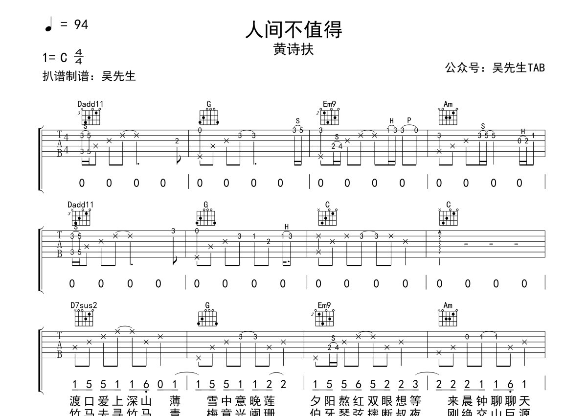 黄诗扶《人间不值得》吉他谱 - C调弹唱六线谱